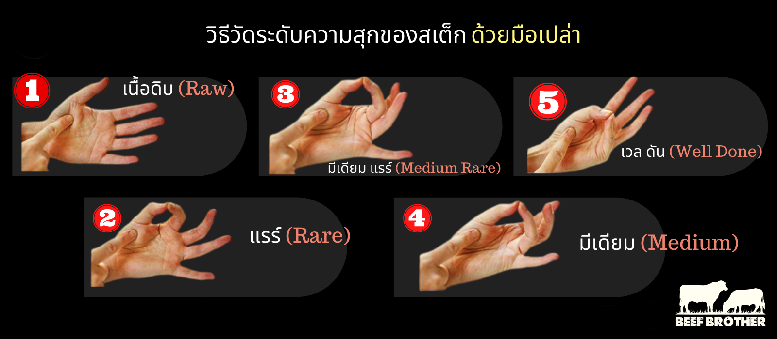 จะเห็นได้ว่าการวัดระดับทั้งความนุ่มและอุณหภูมิของเนื้อจะสามารถประมาณระดับของเนื้อได้ สำหรับใครที่ชอบรับประทานเนื้อแบบไหน ความสุกระดับใด ก็ลองทำตามความชอบได้เลย หากได้ลองทำสักหน่อยแปบเดียวก็จะสามารถควบคุมระดับความสุกให้ตรงกับความต้องการของทั้งเราและลูกค้าเราได้แน่นอนจ้า