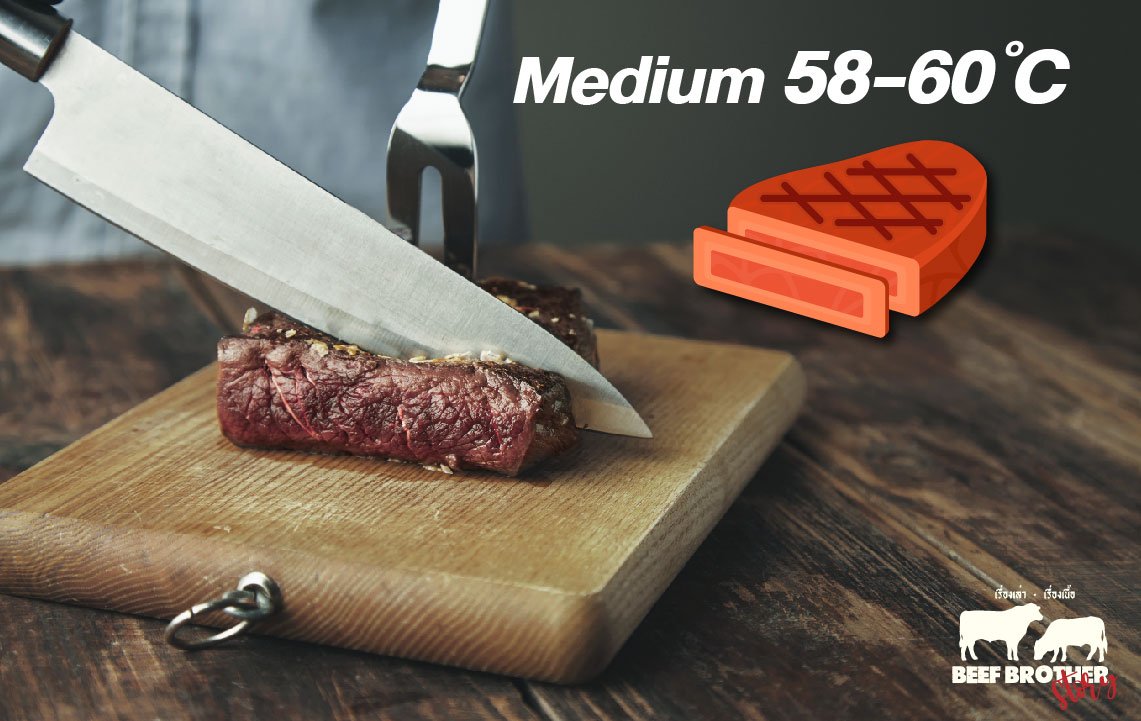 อุณหภูมิ : ภายในชิ้นเนื้อควรวัดได้ประมาณ 58-60 °C