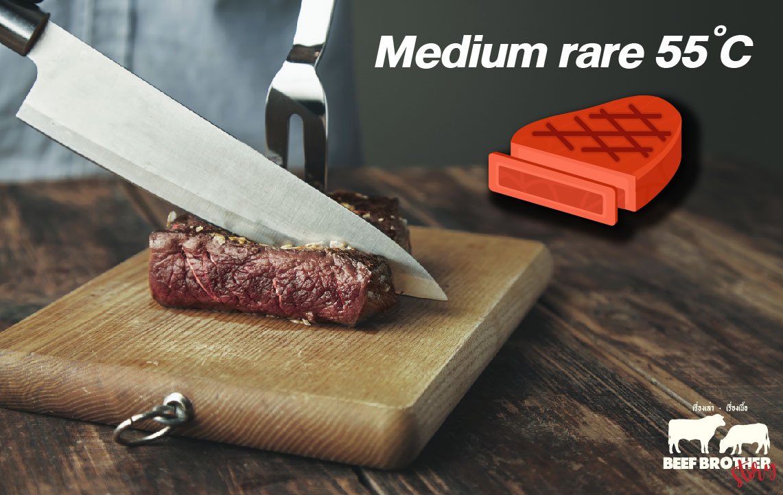 อุณหภูมิ : ภายในชิ้นเนื้อควรวัดได้ประมาณ 54-55 °C