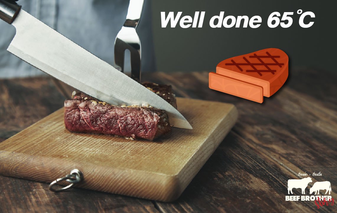 มาถึงระดับความสุกสุดท้าย ซึ่งเนื้อแบบนี้จะมีความสุกในระดับ 100% โดยเนื้อจะเป็นสีน้ำตาลทั้งชิ้นทั้งด้านในและด้านนอก ซึ่งมีความฉ่ำน้อยลงมาก เนื้อสเต็กแบบนี้เชฟส่วนใหญ่ไม่แนะนำและนิยมให้ลูกค้าทานสักเท่าไหร่ เพราะสเน่ห์ของเนื้ออย่างความชุ่มฉ่ำจะหายไปค่อนข้างเยอะ จะมีความกระด้างจากการสุกของเนื้อแบบ 100%