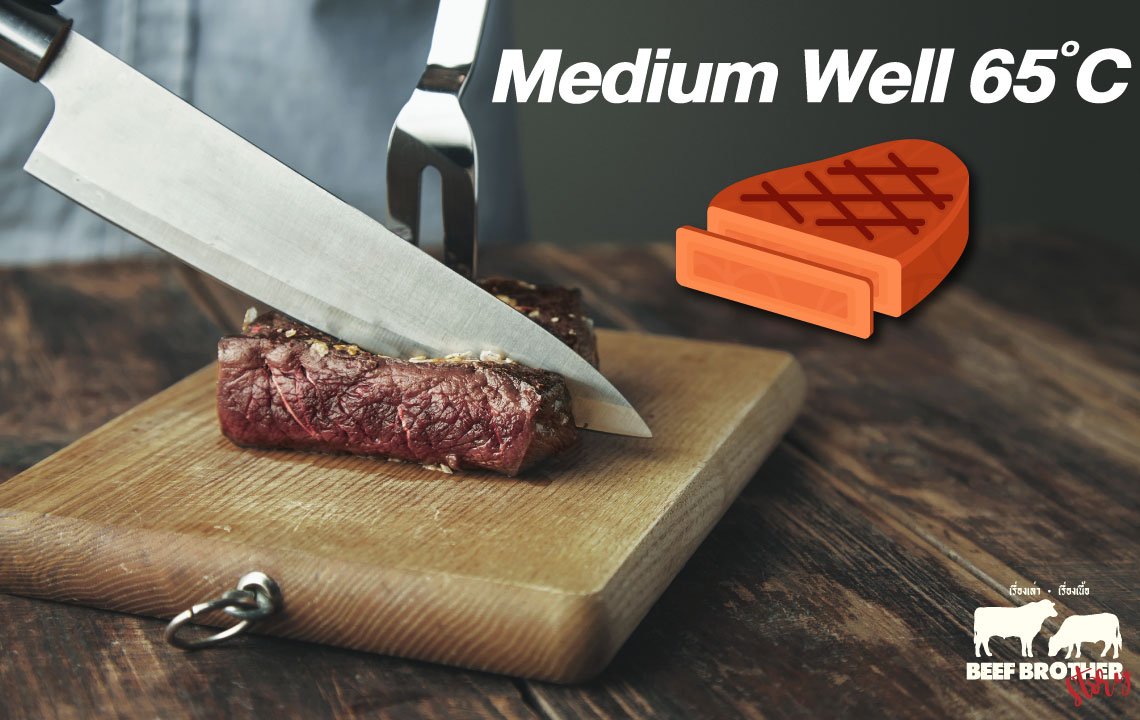 เนื้อสเต็กที่มีระดับความสุกเกือบทั้งชิ้นหรือ 100% เลยทีเดียว โดยตัวเนื้อมีสีน้ำตาลเกือบทั่วทั้งชิ้น ตรงกลางมีสีชมพูอยู่บางๆ เท่านั้น และเนื้อตรงกลางยังคงความนุ่มและฉ่ำอยู่บ้าง