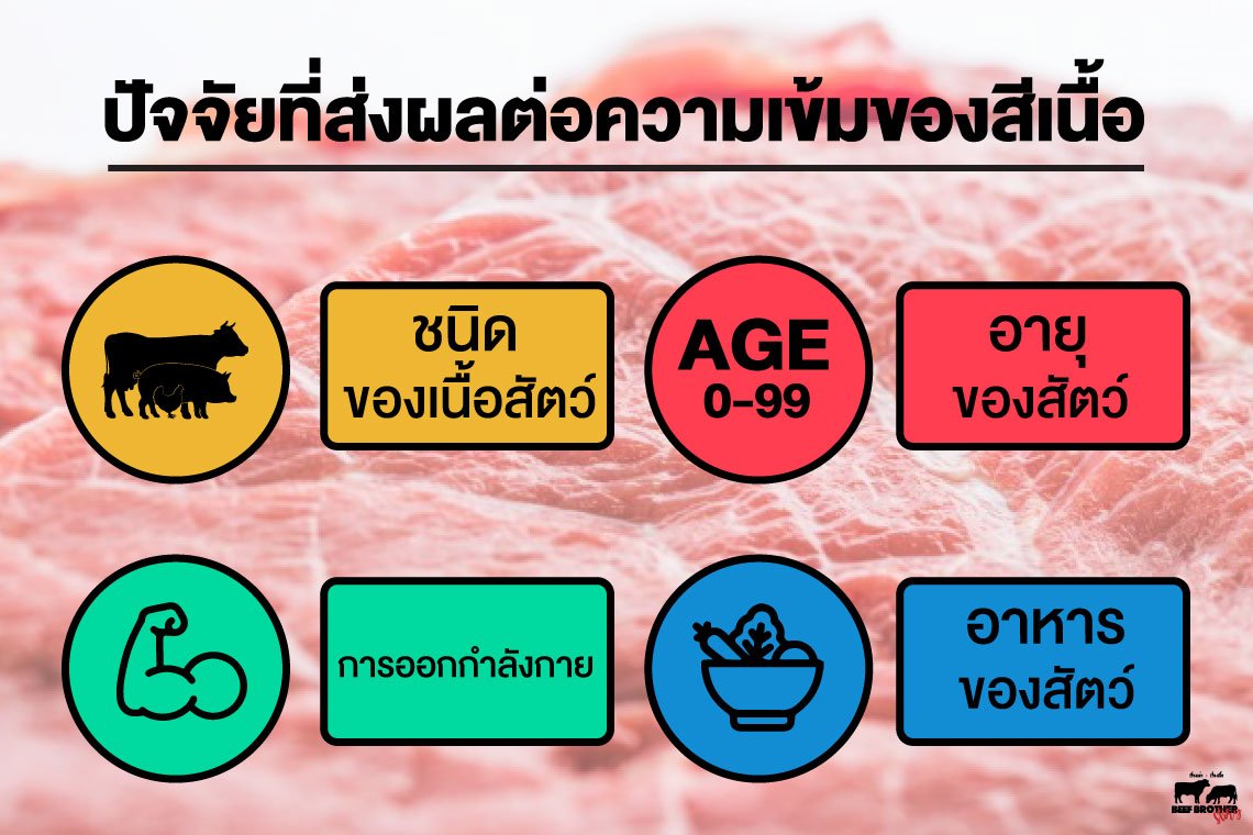 1. ชนิดของเนื้อสัตว์: ปริมาณเม็ดสีในแต่ละชนิดของเนื้อ เช่น เนื้อหมูมีปริมาณไมโอโกลบินน้อยกว่าเนื้อวัว จึงมีสีแดงที่อ่อนกว่า