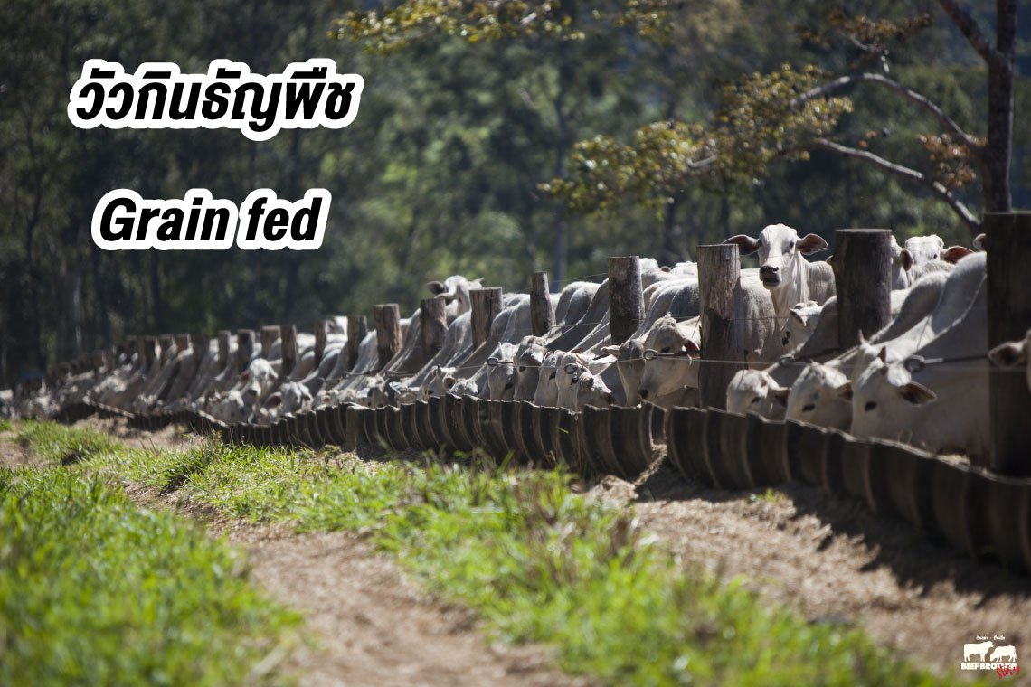 ประเภทวัว Grain Fed จะมีระยะเวลาที่ขุนวัวโดยประมาณแล้ว 100-180 วัน เพื่อทำให้วัวมีปริมาณไขมันแทรกในเนื้อเพิ่มมากขึ้น เราจึงสังเกตได้ว่าเนื้อวัว Grain Fed นั้นจะมีปริมาณไขมันแทรกอยู่ค่อนข้างเยอะ (เนื้อสวย ไขมันแทรกเยอะ) ข้อสังเกตอีกอย่างก็คือสีของไขมัน ไขมันของวัว Grain Fed จะเป็นสีขาว ซึ่งสีไขมันสีขาวนี้เกิดจากการเลี้ยงดูและการกินอาหารของวัว